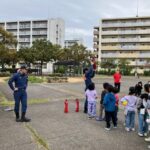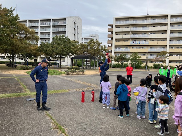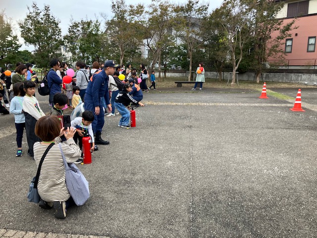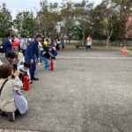 高砂消防署員の方々ご指導のもと、消火器の使い方を学び、実際に水消火器を使って体験もしました。